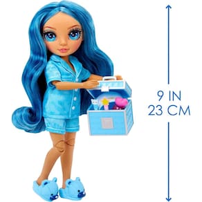 A boneca Rainbow High Junior PJ Party Skyler Bradshaw é indicada para crianças a partir de 4 anos e vem com um pijama de cetim azul, chinelos de urso combinando e lindos cabelos azuis cacheados Ela tem aparência mais jovem, corpo articulado e 23 cm de altura Seu tema é manicure, e por isso acompanha um baú com esmaltes, lixas e luz ultravioleta Pode ser usada sozinha ou junto com a versão maior da personagem, como se fossem irmãs A boneca permite várias poses e oferece muita diversão na festa do pijama