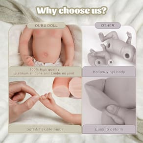 Bonecas renascidas lindamente feitas: as texturas detalhadas no corpo da boneca renascida, os cílios longos e as unhas em forma de meia-lua foram cuidadosamente elaboradas pelo designer. Tamanho realista de bonecas: a boneca renascida tem o tamanho da cabeça aos pés, por isso é perfeita para crianças com mais de 3 anos, que podem segurá-la facilmente. O corpo realista da boneca é muito macio e flexível e pode ser colocado em diferentes posições, ela pode mostrar emoções diferentes com diferentes movimentos corporais. Bonecas realistas para presentes de Natal, aniversários e dia das mães. A boneca Reborn é uma ótima companhia para crianças, pais e idosos que moram sozinhos, mesmo para pacientes com Alzheimer. Certificado de produto infantil: está em conformidade com os requisitos de segurança da ASTM F963 e EN71 para maiores de 3 anos. - REAL FULL SILICONE REBORN BABY: Completamente diferente de uma boneca oca de vinil, ela é toda de silicone e pode ser dobrada. Ela pesa 3,08 libras (1400 gramas) e tem 12 polegadas de comprimento. Ela se sente como um bebê recém-nascido e se sente absolutamente real quando segura em seus braços! - COMPANHEIRO AMIGÁVEL: Seja para encontrar um companheiro de brincadeira para seus filhos e cultivar seu amor, ou para entregá-lo a seus pais para aliviar a solidão, ou como colecionador de bonecas renascido, essa é uma boa escolha. Ela se tornará a existência mais calorosa, trará alegria e acompanhará você o tempo todo. - CARINHO FAMILIAR CALOROSO: Shh, a boneca renascida está dormindo. Você pode trocar de roupa ou deixar seu filho usar a imaginação para interagir com a boneca. Ela não é apenas uma boneca renascida realista, mas também um membro da sua família. - REALISTA - BONECA RECÉM-NASCIDA: SENSAÇÃO REAL DE BEBÊ. Ela tem textura de pele realista, sobrancelhas pintadas à mão e veias realistas. O corpo inteiro de silicone é tão macio quanto um bebê real, muito realista ao toque, você pode até dar banho nela. Ela está ansiosa pelo seu abraço. - COMPRE COM CONFIANÇA: A boneca renascida é adequada para pessoas de todas as idades, atende aos requisitos de segurança da ASTM F963 e EN71 e é adequada para pessoas com 3 anos ou mais, o que é totalmente seguro para seus filhos. Ao mesmo tempo, forneceremos o melhor serviço. Se você encontrar algum problema, pode sempre entrar em contato com nosso serviço pós-venda para processamento.