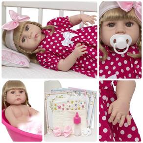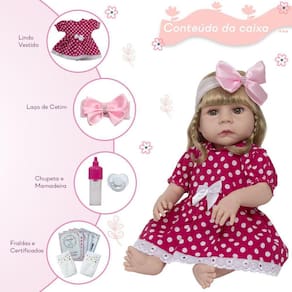 Boneca Reborn Bebê Abigail Vestido Bolinha Rosa 13 Itens