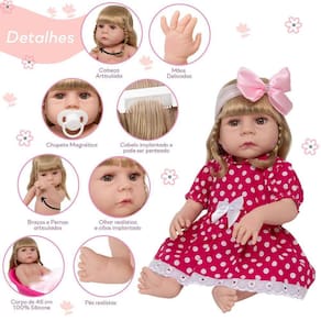 A Boneca Bebê Reborn é o sonho das crianças Produzida 100% em vinil siliconado, essa boneca pode sentar, deitar e fazer tudo que a sua imaginação deixar. Com seus olhos castanhos e detalhes realistas ela é encantadora e apaixonante. Sua criança merece a melhor qualidade de bebê reborn