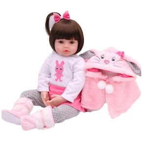 2 descrição do produto: Corpo: vinil siliconado Cor da pele: branca Tamanho: 48 cm aproximadamente Peso: cerca de 900 gramas aproximadamente Olhos: castanhos em acrílico Sexo: feminino com genitália. Cabelos: prótese peruquinha colada material sintético . Sobrancelhas: pintura artística. Pode dar banho, sentar e deitar.