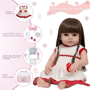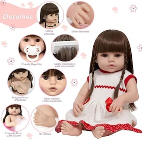A Boneca Bebê Reborn é o sonho das crianças Produzida 100% em vinil siliconado, essa boneca pode sentar, deitar e fazer tudo que a sua imaginação deixar. Com seus olhos castanhos e detalhes realistas ela é encantadora e apaixonante. Sua criança merece a melhor qualidade de bebê reborn
