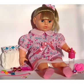 Boneca Bebê reborn, com olho móvel e fala frases. Ela tem 20 acessórios. Melhor custo benefício!!!! Essa linda bebe é super fofa, e grande, como Bebe reborn. Ela mede 50cm altura, tem lindos cabelos loiros, com laço que você pode tirar, tem um par de sapatos rosa e o mais incrível é que você coloca ela pra dormir e ela fecha os olhos de verdade.Ela também fala frases e assim consegue deixar a brincadeira ainda mais realista.Possui vários acessórios, são esses:- Mamadeira mágica, que você vira e o leitinho some,- Chupeta rosa,- Prendedor de chupeta cor rosa, - 1 presilhas de laço, - 1 laço de cabelo,- 3 elástico de cabelo- 6 elástico de silicone- 2 mini piranha , - 1 mecha de cabelo pink, que pode colocar nela , ou em você,- 1 Escova de cabelo pink,- Par de sapatos rosa,- Mecanismo de voz.Você ainda vai ganhar de presente da ED1 Brinquedos, uma linda FRALDA excluisiva de Boneca reborn, pra colocar nela. Tudo que precisa para cuidar de um bebê, tem nela.A ED1brinquedos é uma empresa especializada em fabricação e distribuição de brinquedos, estamos no ramo satisfazendo os clientes com produtos de alta qualidade, atendimento (suporte ao cliente) e agilidade em suas entregas (postagem em 24hrs)Satisfação Garantida!Aa cores da roupa, sapatos, laços, podem variar.Dados do produto:Peso aprox. 1. gMembros da boneca em vinil macio e corpo em tecido com enchimento de fibra siliconada.Boneca estilizada por ED1 BrinquedosIdade mínima recomendada: 3 anos