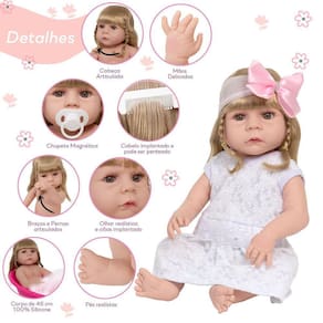 A Boneca Bebê Reborn é o sonho das crianças Produzida 100% em vinil siliconado, essa boneca pode sentar, deitar e fazer tudo que a sua imaginação deixar. Com seus olhos castanhos e detalhes realistas ela é encantadora e apaixonante. Sua criança merece a melhor qualidade de bebê reborn