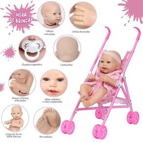 A Boneca Bebê Reborn é o sonho das meninas Produzida 100% em vinil siliconado, essa boneca pode fazer tudo que a sua imaginação deixar. Com seus olhos claros e detalhes realistas ela é encantadora e apaixonante. Acompanha um lindo carrinho para poder passear com o bebê. Sua criança merece a melhor qualidade de bebê reborn