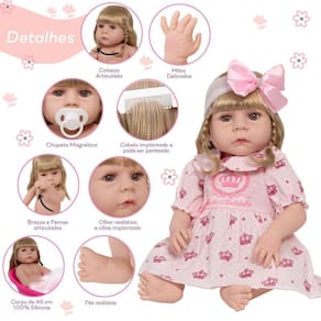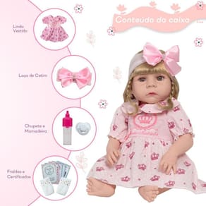 A Boneca Bebê Reborn é o sonho das crianças Produzida 100% em vinil siliconado, essa boneca pode sentar, deitar e fazer tudo que a sua imaginação deixar. Com seus olhos castanhos e detalhes realistas ela é encantadora e apaixonante. Sua criança merece a melhor qualidade de bebê reborn