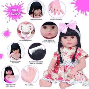 A Boneca Bebê Reborn é o sonho das meninas Produzida 100% em vinil siliconado, essa boneca pode sentar, deitar e fazer tudo que a sua imaginação deixar. Com seus olhos castanhos e detalhes realistas ela é encantadora e apaixonante. Sua criança merece a melhor qualidade de bebê reborn