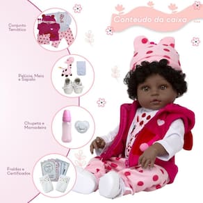 A nossa empresa tem a missão de garantir a total satisfação de seus clientes, onde a qualidade e o atendimento excepcional são nossa prioridade Estamos muito felizes em apresentar a Boneca Bebê Reborn Girafinha para você, um item cuidadosamente selecionado para atender às suas necessidades. Compre agora e experimente a diferença em comprar com a nossa loja. A Boneca Bebê Reborn Girafinha é o sonho das crianças Produzida 100% em vinil siliconado, essa boneca pode sentar, deitar e fazer tudo que a sua imaginação deixar. Com seus olhos castanhos e detalhes realistas ela é encantadora e apaixonante. Sua criança merece a melhor qualidade de bebê reborn Marca: Cegonha Reborn Dolls Modelo: Boneca Bebê Reborn Girafinha Cor: Marrom Material: Vinil Siliconado Atóxico Características Principais: Membros Articulados, Corpo de Silicone, Detalhes Realistas. Medidas Aprox.: Altura da Boneca: 46cm Peso Aprox. Da Boneca: 0,745 Kg Certificado INMETRO Recomendado para crianças maiores de 03 anos Conteúdo: 1 Bebê Reborn Cabeça, Membros e Corpo de Vinil 1 Conjunto Roupa Girafinha 1 Par de Cílios 1 Par de Brincos 1 Chupeta 1 Mamadeira Simples 5 Certificados 2 Fraldas 1 Pelúcia 1 Par de Sapatinhos 30 dias de oferecida pelo fabricante. Dúvidas Frequentes: 1. Ela acompanha Itens R. Sim, todos os itens da descrição. 2. Ela emite algum som R. Não, ela não emite nenhum som. 3. Pode dar banho na boneca R. Sim, pois o material do corpo é de Silicone. 4. Pode escolher a cor dos olhos da boneca R. Não, os olhos já vêm de fábrica. Tags: Realista, Menina, Infantil, Silicone, Princesa, Linda, Morena, Loira, Fofa, Banho, Enxoval, Completo, Grande, Baby Alive. Homologação Inmetro: IP-BRI-0406/2022-07