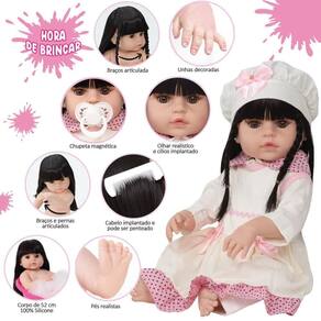 A nossa empresa tem a missão de garantir a total satisfação de seus clientes, onde a qualidade e o atendimento excepcional são nossa prioridade Estamos muito felizes em apresentar a Boneca Bebê Reborn para você, um item cuidadosamente selecionado para atender às suas necessidades. Compre agora e experimente a diferença em comprar com a nossa loja.A Boneca Bebê Reborn é o sonho das meninas Produzida 100% em vinil siliconado, essa boneca pode sentar, deitar e fazer tudo que a sua imaginação deixar. Com seus olhos castanhos e detalhes realistas ela é encantadora e apaixonante. Sua criança merece a melhor qualidade de bebê reborn Marca: Cegonha Reborn DollsModelo: Boneca Bebê Reborn Cor: BegeMaterial: Vinil Siliconado AtóxicoCaracterísticas Principais: Membros Articulados, Corpo de Silicone, Detalhes Realistas.Medidas Aprox.: Altura da Boneca: 52cm Peso Aprox. Da Boneca: 0,745 Kg Certificado INMETRO Recomendado para crianças maiores de 03 anosConteúdo:1 Bebê Reborn Cabeça, Membros e Corpo de Vinil 1 Conjunto de Roupa Luxo1 Par de Cílios1 Par de Brinco1 Chupeta1 Mamadeira Simples5 Certificados2 Fraldas1 Laço CetimGarantia30 dias de garantia oferecida pelo fabricante.Dúvidas Frequentes:1. Ela acompanha ItensR. Sim, todos os itens da descrição.2. Ela emite algum somR. Não, ela não emite nenhum som.3. Pode dar banho na bonecaR. Sim, pois o material do corpo é de Silicone.4. Pode escolher a cor dos olhos da bonecaR. Não, os olhos já vêm de fábrica.Tags: Boneca, Bebe, Reborn, Realista, Menina, Infantil, Silicone, Princesa, Linda, Morena, Loira, Fofa, Banho, Enxoval, Completo, Grande, Baby Alive.Homologação Inmetro: IP-BRI-0261/2022-05