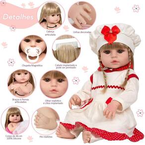 A Boneca Bebê Reborn é o sonho das crianças Produzida 100% em vinil siliconado, essa boneca pode sentar, deitar e fazer tudo que a sua imaginação deixar. Com seus olhos castanhos e detalhes realistas ela é encantadora e apaixonante. Sua criança merece a melhor qualidade de bebê reborn