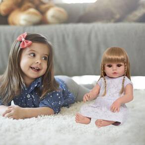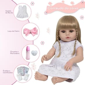 A Boneca Bebê Reborn é o sonho das crianças Produzida 100% em vinil siliconado, essa boneca pode sentar, deitar e fazer tudo que a sua imaginação deixar. Com seus olhos castanhos e detalhes realistas ela é encantadora e apaixonante. Sua criança merece a melhor qualidade de bebê reborn