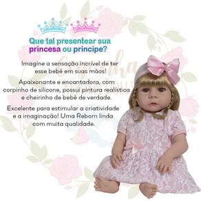 A Boneca Bebê Reborn é o sonho das crianças Produzida 100% em vinil siliconado, essa boneca pode sentar, deitar e fazer tudo que a sua imaginação deixar. Com seus olhos castanhos e detalhes realistas ela é encantadora e apaixonante. Sua criança merece a melhor qualidade de bebê reborn