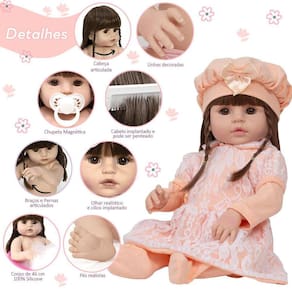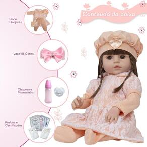 A Boneca Bebê Reborn é o sonho das crianças Produzida 100% em vinil siliconado, essa boneca pode sentar, deitar e fazer tudo que a sua imaginação deixar. Com seus olhos castanhos e detalhes realistas ela é encantadora e apaixonante. Sua criança merece a melhor qualidade de bebê reborn