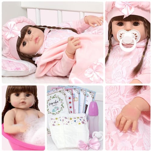 A nossa empresa tem a missão de garantir a total satisfação de seus clientes, onde a qualidade e o atendimento excepcional são nossa prioridade Estamos muito felizes em apresentar a Boneca Bebê Reborn para você, um item cuidadosamente selecionado para atender às suas necessidades. Compre agora e experimente a diferença em comprar com a nossa loja.A Boneca Bebê Reborn é o sonho das crianças Produzida 100% em vinil siliconado, essa boneca pode sentar, deitar e fazer tudo que a sua imaginação deixar. Com seus olhos castanhos e detalhes realistas ela é encantadora e apaixonante. Sua criança merece a melhor qualidade de bebê reborn Marca: Cegonha Reborn DollsModelo: Boneca Bebê Reborn Cor: BegeMaterial: Vinil Siliconado AtóxicoCaracterísticas Principais: Membros Articulados, Corpo de Silicone, Detalhes Realistas.Medidas Aprox.: Altura da Boneca: 46cm Peso Aprox. Da Boneca: 0,745 Kg Certificado INMETRO Recomendado para crianças maiores de 03 anosConteúdo:1 Bebê Reborn Cabeça, Membros e Corpo de Vinil 1 Conjunto Roupa Luxo1 Par de Cílios1 Par de Brinco1 Chupeta1 Mamadeira Simples5 Certificados2 Fraldas1 Laço CetimGarantia30 dias de garantia oferecida pelo fabricante.Dúvidas Frequentes:1. Ela acompanha ItensR. Sim, todos os itens da descrição.2. Ela emite algum somR. Não, ela não emite nenhum som.3. Pode dar banho na bonecaR. Sim, pois o material do corpo é de Silicone.4. Pode escolher a cor dos olhos da bonecaR. Não, os olhos já vêm de fábrica.Tags: Realista, Menina, Infantil, Silicone, Princesa, Linda, Morena, Loira, Fofa, Banho, Enxoval, Completo, Grande, Baby Alive.Homologação Inmetro: IP-BRI-0261/2022-05