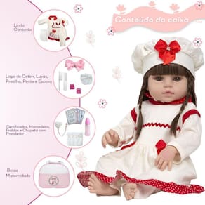 A Boneca Bebê Reborn é o sonho das crianças Produzida 100% em vinil siliconado, essa boneca pode sentar, deitar e fazer tudo que a sua imaginação deixar. Com seus olhos castanhos e detalhes realistas ela é encantadora e apaixonante. Sua criança merece a melhor qualidade de bebê reborn