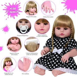 A Boneca Bebê Reborn é o sonho das meninas Produzida 100% em vinil siliconado, essa boneca pode sentar, deitar e fazer tudo que a sua imaginação deixar. Com seus olhos castanhos e detalhes realistas ela é encantadora e apaixonante. Sua criança merece a melhor qualidade de bebê reborn