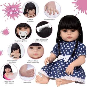 A Boneca Bebê Reborn é o sonho das meninas Produzida 100% em vinil siliconado, essa boneca pode sentar, deitar e fazer tudo que a sua imaginação deixar. Com seus olhos castanhos e detalhes realistas ela é encantadora e apaixonante. Sua criança merece a melhor qualidade de bebê reborn