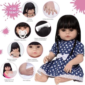 A Boneca Bebê Reborn é o sonho das meninas Produzida 100% em vinil siliconado, essa boneca pode sentar, deitar e fazer tudo que a sua imaginação deixar. Com seus olhos castanhos e detalhes realistas ela é encantadora e apaixonante. Sua criança merece a melhor qualidade de bebê reborn
