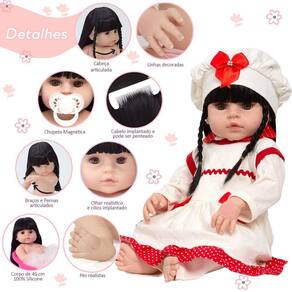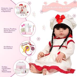 A Boneca Bebê Reborn é o sonho das crianças Produzida 100% em vinil siliconado, essa boneca pode sentar, deitar e fazer tudo que a sua imaginação deixar. Com seus olhos castanhos e detalhes realistas ela é encantadora e apaixonante. Sua criança merece a melhor qualidade de bebê reborn
