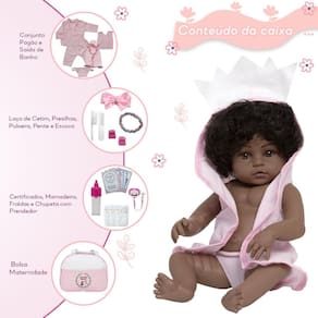 Conteúdo: 1 Bebê Reborn Cabeça, Membros e Corpo de Vinil 1 Conjunto Pagão com Saída de Banho 1 Par de Cílios 1 Par de Brincos 1 Chupeta 1 Mamadeira Simples 5 Certificados 3 Fraldas 1 Laço Cetim 1 Pulseira 2 Presilhinha 1 Par de Luvas 1 Bolsa Maternidade 1 Prendedor de Chupeta Kit Pente e Escova Simples