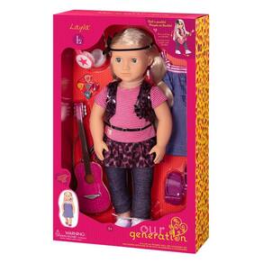 Sua música irá capturar a imaginação do público em todos os lugares com Our Generation Boneca Deluxe - Layla, uma linda boneca com olhos azuis e longos cabelos loiros tingidos de roxo, bem rock 'n' roll e divertido de pentear e pentear. Layla está pronta para cantar! Ela usa sua roupa de performance - uma camiseta rosa, legging azul com saia de estampa de leopardo, um colete de lantejoulas, faixa para a cabeça e seus óculos de sol favoritos em forma de estrela. Sua segunda roupa inclui um vestido jeans doce e confortável e sapatos baixos. Não se esqueça do violão dela! Ela vem com outros acessórios legais para músicos também!