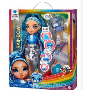 Skyler Bradshaw da Rainbow High exibe um look vibrante, inteiramente azul, repleto de brilho. Seu visual destaca um rabo de cavalo longo e azul, cílios longos, olhos de vidro e maquiagem reluzente. A roupa é complementada por sapatos e uma bolsa personalizáveis, que podem mudar de cor com um toque de slime.