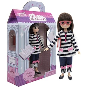 . BONECA COM LIVRO Lottie adora se enrolar perto do fogo com seu livro favoritoDOLL COM ÓCULOS Livro de histórias vermelhos e almofada de creme fofoDOLL ROUPAS incluem uma roupa listrada de mangas compridas com laços rosa adoráveis e sapatos marinho Mary-JanePACKABLE &. PORTÁTIL Perfeito para mãos pequenas Lottie está pronta para presentearMINI DOLL BOOKS Lottie está pronta para aventuras em sua imaginação