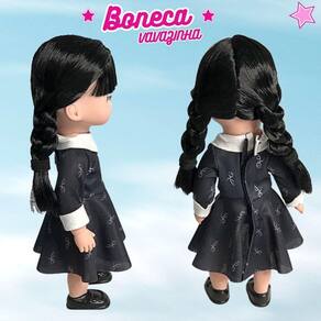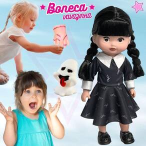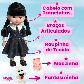 Essa boneca inspirada na Wandinha, veio para tornar suas brincadeiras ainda mais divertidas. Feita com ricos detalhes da personagem, com franjinha e roupinha toda preta, traz todo encanto e diversão que encontramos na série. A boneca tem 31cm de comprimento com corpinho emborrachado e articulado, feita em borracha macia não trás riscos em machucar a criança.