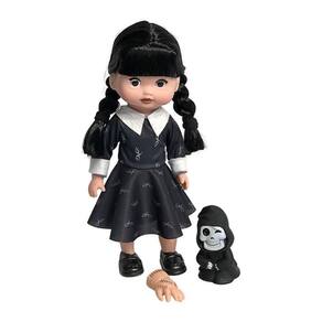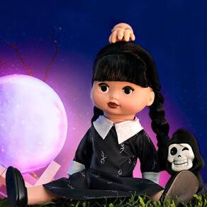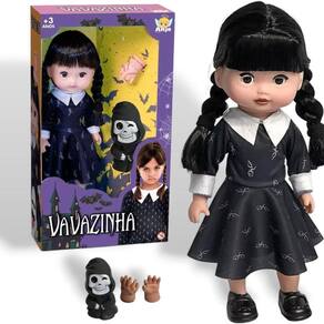 Boneca Vavazinha Com Mãozinha Essa boneca, com inspiração na Wandinha, veio para tornar suas brincadeiras ainda mais divertidas. Feita com ricos detalhes da personagem, com franjinha e roupinha toda preta, traz todo encanto e diversão que encontramos na série. A boneca tem 30cm de comprimento com corpinho emborrachado e articulado, feita em borracha macia não trás riscos em machucar a criança. Além disso, vêm acompanhada de sua amiga inseparável, a Mãozinhae um fantasminha, ambos feitos em borracha macia, deixando a brincadeira ainda mais completa. Solte a imaginação e leve sua companheira para onde for.