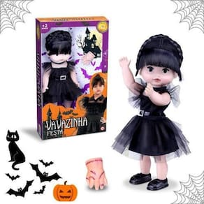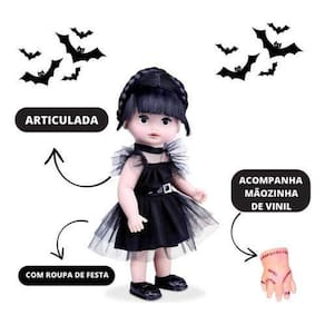 Inspirada na Série Wandinha, essa boneca veio para tornar suas brincadeiras ainda mais divertidas. Imitando com ricos detalhes da personagem Wandinha Adams, com franjinha e seu novo vestido de festa, novo penteado e sapatinhos pretos, traz todo encanto e diversão. Além disso, vêm acompanhada de sua amiga inseparável, a Mãozinha , feitos em vinil macio, deixando a brincadeira ainda mais completa.
