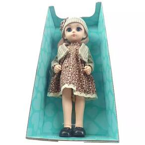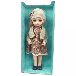 Com aproximadamente 35 cm de altura, a boneca vem vestida com um lindo vestido estampado, cardigã de tricô e gorro combinando, prontos para brincar de moda e imaginação.