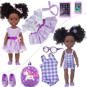 O pacote inclui: boneca de 14,5 polegadas, 2 conjuntos de roupas de boneca, 1 sapato, 1 mochila, 1 câmera, 1 óculos, 1 grampo de cabelo, 1 bandana, 1 telefone, 1 iPad Detalhes do produto: As roupas da boneca são removíveis e laváveis. Limpe-as com um pano úmido se a boneca ficar suja. Presente perfeito para crianças: presente de Natal perfeito, presente de aniversário, presente de recompensa para sua filha, neta ou sobrinha! Nesses dias especiais, eles gostam de embrulhar presentes e receber presentes. Temos certeza de que seus filhos vão adorar a boneca. NOTA: Se você tiver algum problema com seus itens, a QUALQUER MOMENTO, nós lhe daremos uma resposta rápida. - O pacote inclui: boneca de 14,5 polegadas, 2 conjuntos de roupas para bonecas, 1 sapato, 1 mochila, 1 câmera, 1 óculos, 1 grampo de cabelo, 1 bandana, 1 telefone, 1 iPad. - Black Dolls: bom toque e rosto fofo. Parece realmente realista. A cabeça e os membros podem girar, sentar e deitar. As roupas da boneca são removíveis e laváveis, você pode comprar outras roupas para vesti-la. - Qualidade segura premium: não perfumada e lavável, macia e suave, inofensiva para crianças e ecológica. Limpe com um pano úmido se a boneca ficar suja. - Presente ideal: presente para seus filhos, seus amigos e você mesmo. Perfeito como presente de Natal, presente de aniversário, presente de Ano Novo, lembrancinha e outro presente de Natal. - Garantia de serviço: prestaremos atenção à sua experiência de compra. Se você tiver alguma dúvida ou sugestão sobre os produtos que recebe, a tempo e resolveremos o problema para você