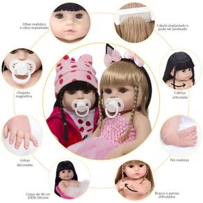 Bonecas Bebê Reborn Gêmeas Girafinha Coelhinha Enxoval 28 Itens - Cegonha Reborn Dolls As Bonecas Bebê Reborn Gêmeas Girafinha Coelhinha são o sonho de todas as meninas! Produzidas pela renomada marca Cegonha Reborn Dolls, essas bonecas são feitas com vinil siliconado atóxico de alta qualidade, garantindo a melhor experiência para as crianças. Com seus detalhes realistas e olhos castanhos encantadores, as Bonecas Bebê Reborn Gêmeas são irresistíveis. Elas podem sentar, deitar e fazer tudo o que a imaginação permitir. Com membros articulados e corpo de silicone, essas bonecas são muito próximas da realidade. Medindo aproximadamente 46cm de altura e pesando cerca de 0,745kg, as Bonecas Bebê Reborn Gêmeas são perfeitas para crianças maiores de 03 anos. Elas vêm acompanhadas de um conjunto de roupa girafinha e um conjunto de roupa coelhinha, além de dois pares de cílios, dois pares de brincos, duas chupetas, duas mamadeiras simples, dez certificados, quatro fraldas, um par de sapatinhos e um par de sandalinhas. E para deixar tudo ainda mais especial, as bonecas vêm acompanhadas de duas pelúcias . Essas bonecas são certificadas pelo INMETRO, garantindo a sua segurança e qualidade. Elas não emitem nenhum som e podem ser banhadas, pois o material do corpo é de silicone. Vale ressaltar que os olhos das bonecas não podem ser escolhidos, pois já vêm de fábrica. Garanta agora mesmo as Bonecas Bebê Reborn Gêmeas Girafinha Coelhinha com enxoval completo de 28 itens e proporcione momentos de diversão e encanto para as crianças. Compre já e experimente a diferença de adquirir um produto de alta qualidade com a nossa loja. Palavras-chave: Reborn, Realista, Menina, Infantil, Silicone, Princesa, Linda, Morena, Loira, Fofa, Banho, Enxoval, Completo, Grande. Homologação Inmetro: CE-BRI/IQB 006042 54693/21-001