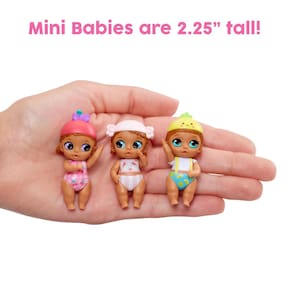 - Minibebês surpresas: desembrulhe um pacote de surpresas. Dentro de cada cueiro fofo, encontre duas ou três mini bonecas colecionáveis dentro. Quantos bebês você receberá?