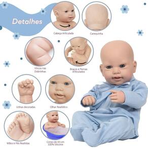 3. Posso dar banho no boneco? R: Sim, o Boneco Bebê Reborn Luca pode ser banhado, pois seu corpo é feito de silicone.