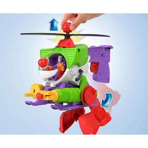 Levante a hélice para transformar o helicóptero em um robô de 25,4 cm de altura A figura do Coringa cabe dentro do cockpit Aperte a alça para girar as hélices e pressione os Power Pads para lançar os projéteis