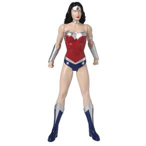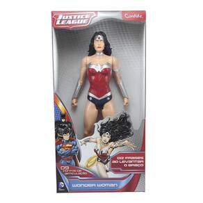 Boneco da Mulher Maravilha com 14 polegadas e 4 frases que são acionadas com o movimento do braço. Possui 9 pontos de articulação.(utiliza 3 bat LR-44-inclusas para demonstração)