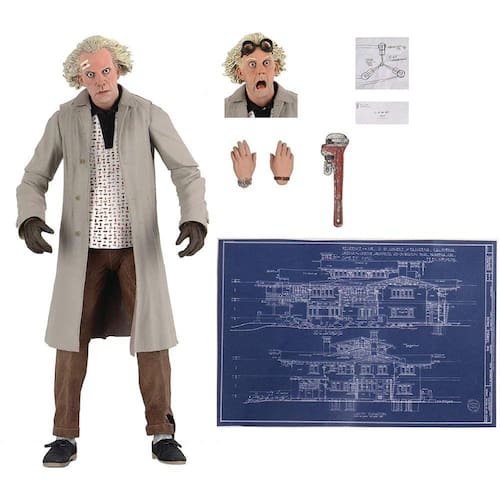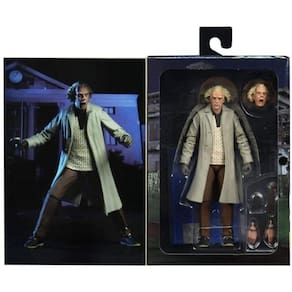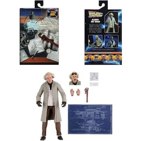 Grande Scott! Dr. Emmett Brown, o gênio por trás da primeira máquina e um dos maiores personagens de filmes de todos os tempos, está se juntando à linha Ultimate da NECA. Usando as semelhanças oficiais licenciadas do ator Christopher Lloyd. Ultimate Doc Brown é baseado em sua aparição em 1955 em Back to the Future com 2 cabeças intercambiáveis retratando uma expressão genérica e a expressão icônica chocada. Para ajudar Marty a voltar para 1985, Doc Brown também vem com uma chave inglesa, desenho do capacitor de fluxo, mãos intercambiáveis, um projeto de sua casa, e uma carta de Marty! Vem na embalagem da caixa da janela