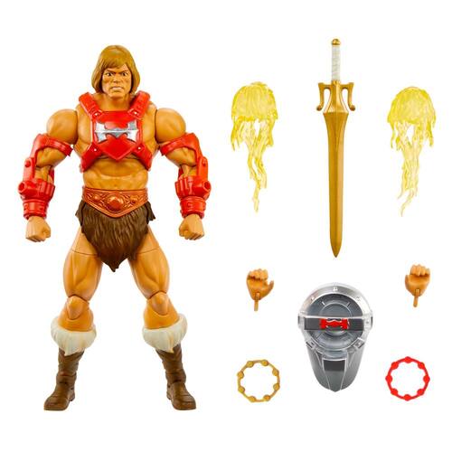 - He-Man tem efeitos de mão Thunder Punch, uma Power Sword que pode ser armazenada em seu escudo e acessórios Thunder Cap vermelhos e dourados que se conectam à mochila ou ao escudo, uma homenagem aos bonés explosivos da figura autêntico.