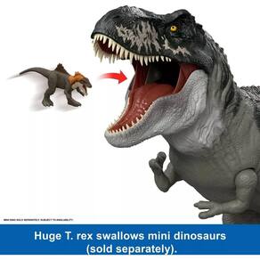 - T. rex em grande escala Traga a emoção e as emoções do Jurassic World Rebirth para casa com este enorme boneco de ação Tyrannosaurus rex de 99 cm de comprimento