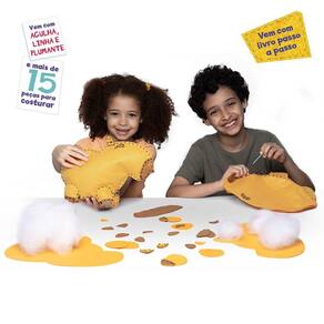 A: O kit inclui feltro, linha, agulha, enchimento e um livro com instruções passo a passo.