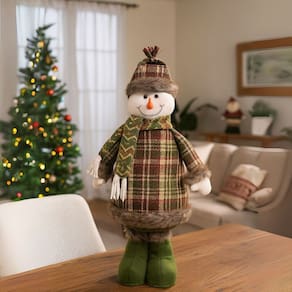 Deixe sua decoração natalina mais charmosa com o Boneco de Neve em pé em pelúcia premium, vestido com roupa, gorro e cachecol estilo crochê em padrão xadrez verde. Um enfeite encantador que une delicadeza e sofisticação, ideal para quem busca destaque e aconchego na decoração de Natal.