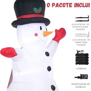1 Boneco de Neve Inflável 2,40m 1 Fonte de alimentação - BIVOLT 1 Soprador de ar 2 Cabos fixadores