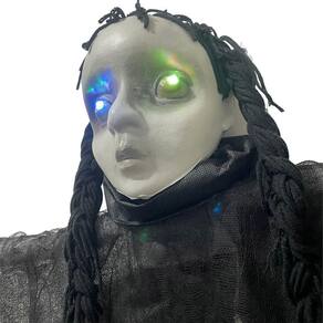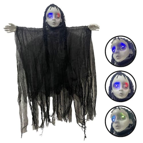 Os vizinhos e parentes ficarão impressionados com o Boneco Halloween Pendurado Criança Fantasma Som e Luz, com seu rosto tão realista e suas belas tranças. O fio de suspensão permite colocá-lo em qualquer lugar da casa, como na varanda ou na sala, criando uma atmosfera de mistério e terror que encantará todos os convidados.
