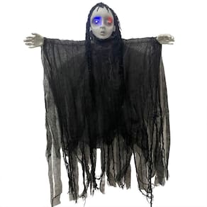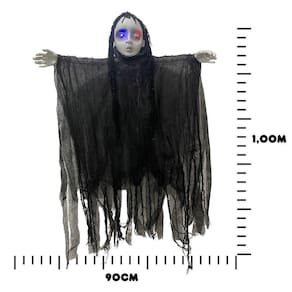 Prepare-se para surpreender com o Boneco Halloween Pendurado Criança Fantasma Som e Luz! Este boneco assombroso de 90 cm por 1m, em preto e branco com rosto acinzentado, é perfeito para decorar sua festa de Halloween. Seu rosto inexpressivo e realista causará arrepios, enquanto as belas tranças adicionam um toque encantador. Com um fio de suspensão, você pode posicioná-lo facilmente na varanda ou na sala, assustando e impressionando vizinhos e parentes.