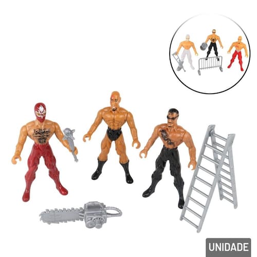 Boneco Luta Livre com Acessórios 6 Peças So O Boneco Luta Livre com Acessórios 6 Peças é o kit ideal para quem ama ação e desafios no ringue! O conjunto vem com três bonecos prontos para grandes combates, acompanhados de acessórios como escada, peso e martelo, deixando as batalhas ainda mais emocionantes.\nCom um design detalhado e material resistente, os bonecos permitem recriar lutas incríveis e estimular a imaginação. Perfeito para crianças e fãs de luta livre que querem criar seus próprios torneios e descobrir quem será o grande campeão!\nMarca : SATYAM\nTipo de material : Plástico\nCores ou Estampa :\nDimensões do Produto : 22,5 X 25 X 3 CM\nDimensões da Embalagem : 22,5 X 25 X 3 CM\nPeso Bruto (Gramas) : 0.095
