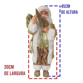 Este é um boneco do papai noel de 45cm de altura, com incriveis detalhes em sua vestimenta, rosto e até os adornos que o mesmo carrega. Ele tem em sua mão uma linda arvore dourado e carrega um saco repleto de presentes e enfeites. Ele é feito de Polipropileno em sua estrutura, rosto e mãos e para sua vestimenta contamos com Veludo e Poliester e um guizo para completar em seu gorro. Faça a mágia do natal acontecer, seja na sua casa, escritorio ou estabelecimento com este lindo Papai Noel! Caracteristicas: Materiais: Veludo, Poliéster e Polipropileno Detalhes incríveis Dourado Resistente Guizo na ponta do gorro Excelente para decorar seu natal. Dimensões Aproximadas: Altura: 45cm Largura: 20cm Comprimento: 20cm Conteúdo da Embalagem: 1x Boneco Papai Noel 3 meses de garantia contra defeito de fabricação **450 MOD: BSL-36041-50C