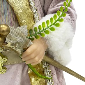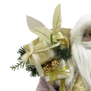 Este adorável boneco de Papai Noel é uma adição encantadora à decoração de Natal, trazendo um toque de sofisticação e alegria para qualquer ambiente festivo. Seu brilho dourado e sua pureza branca refletem perfeitamente o espírito natalino, prometendo encantar a todos durante a temporada de festas.