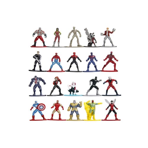 Bonecos colecionáveis Marvel de metal fundido de 4,16 cm, pacote com 20, onda 1, brinquedos para crianças e adultos - Autenticamente licenciado pela Marvel - Feito de materiais duráveis, como 100% metal fundido e tintas metálicas premium, a qualidade desses bonecos é inegável. - Com cerca de 4 cm e pesando aproximadamente 30 g. - Bonecos altamente colecionáveis incluídos neste pacote com 20, misture e combine os diferentes personagens do universo Marvel. - Nosso método de fundição de alta qualidade nos permite capturar o estilo, poses e qualidade única de vários personagens da Marvel. - Inclui: Drax, Gamora, Groot, rocket, Star-Lord, Winter Soldier, proto-suit Spider-Man, Spider-Man superior, Homem-Aranha 2099, Carnificina, Venom, Spider-Girl, Fantasma-Spider, Pantera Negra, Homem-Formiga, Capitão América, Homem de Ferro, Thanos, visão, Vespa