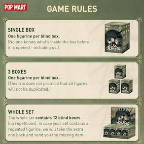 - Design aleatório: as caixas cegas são totalmente aleatórias e não podemos aceitar solicitações de itens específicos. As chances de obter a edição secreta geralmente são de 1/144. Ao comprar o conjunto completo, não haverá figuras duplicadas.